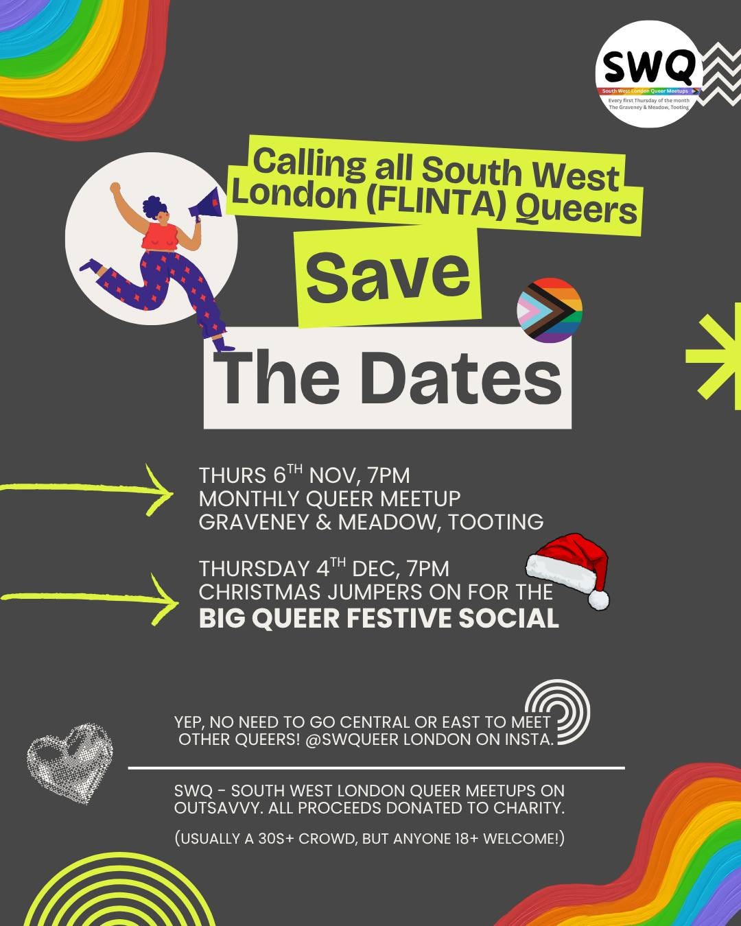 South West London Queer London meet on the first Thursday each month at Graveney and Meadow in Tooting Broadway – and they have two more events this year, on 6th November, and their Big Festive Social on 4th December!