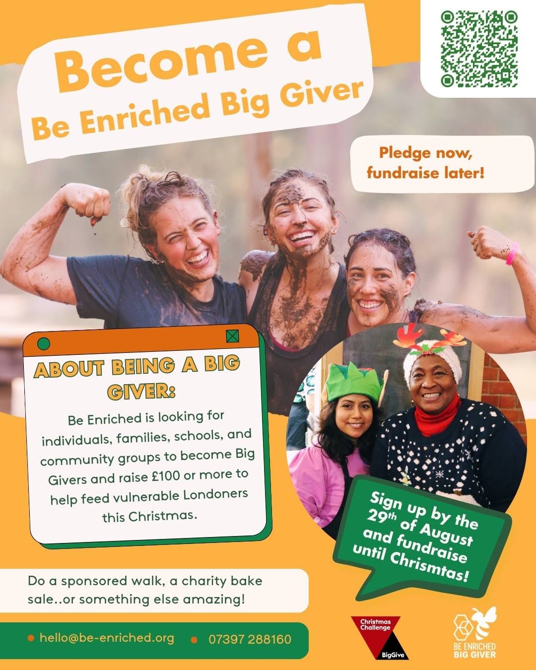 Tooting-based charity Be Enriched is looking for individuals, families, schools, and community groups to become Big Givers and raise £100 or more to help feed vulnerable Londoners this Christmas – sign up by 29 August to take part (info below)!