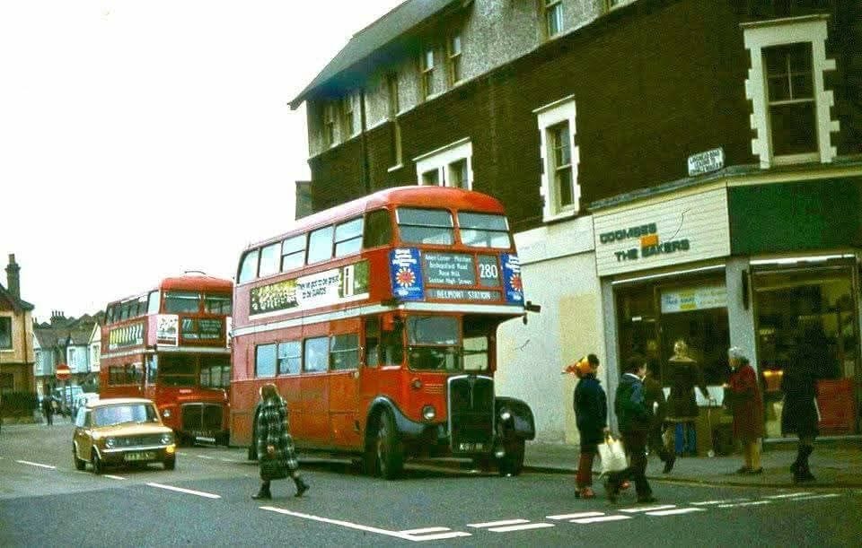 Tooting in 1974 and the 280 bus parked outside Coombes the Bakers (now a Greggs) on the corner of Mitcham and Longmead Road!