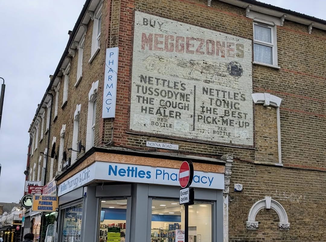 We love a ghost sign (an old hand-painted advertising sign that has been preserved on a building) and we're lucky to have a few classic examples around Tooting, like this Meggezones sign on the corner of Noyna Road and Upper Tooting Road, above Nettles Pharmacy!