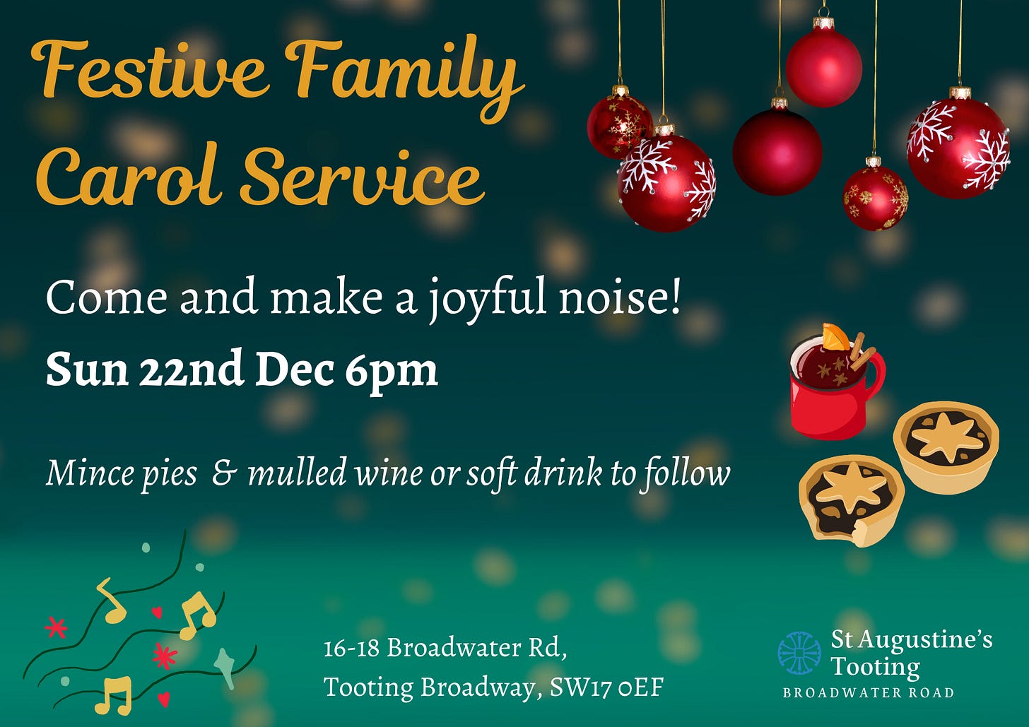 Festive Family Carol Service at St Augustine's Church, Tooting this Sunday 22nd December at 6pm, with mince pies and mulled wine / soft drinks to follow. All welcome!