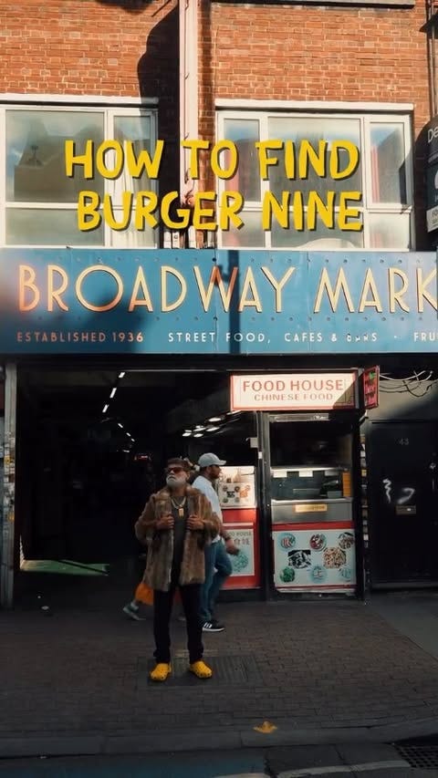 Find Burger Nine near the Longmead Rd entrance of Broadway Market. Open 12pm-10.30pm Monday to Thursday, 12pm-11.30pm Friday and Saturday, and 12pm-9pm Sunday. Halal options available. Offer valid every Tuesday for eat-in and takeaway until 30/09/2025. Ts and Cs apply. More info via their Instagram.