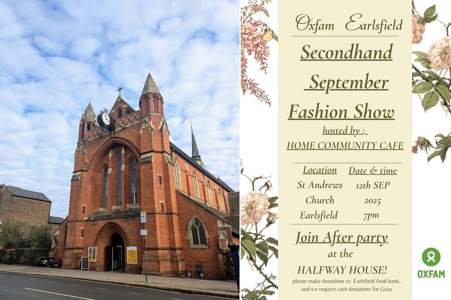 Oxfam Earlsfield holds its Annual Fashion Show, hosted by the Home Community Café at St Andrews Church, on Friday 12th of September at 7pm, where they’ll be showcasing outfits that have recently been donated to Oxfam Earlsfield.