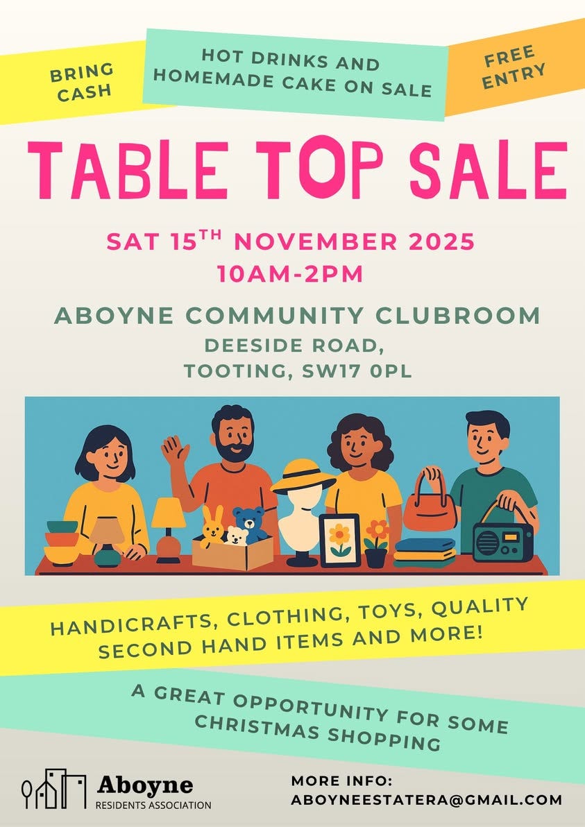 TABLE TOP SALE in Tooting this Saturday, 15th November, 10am-2pm, at the Aboyne Community Clubroom!