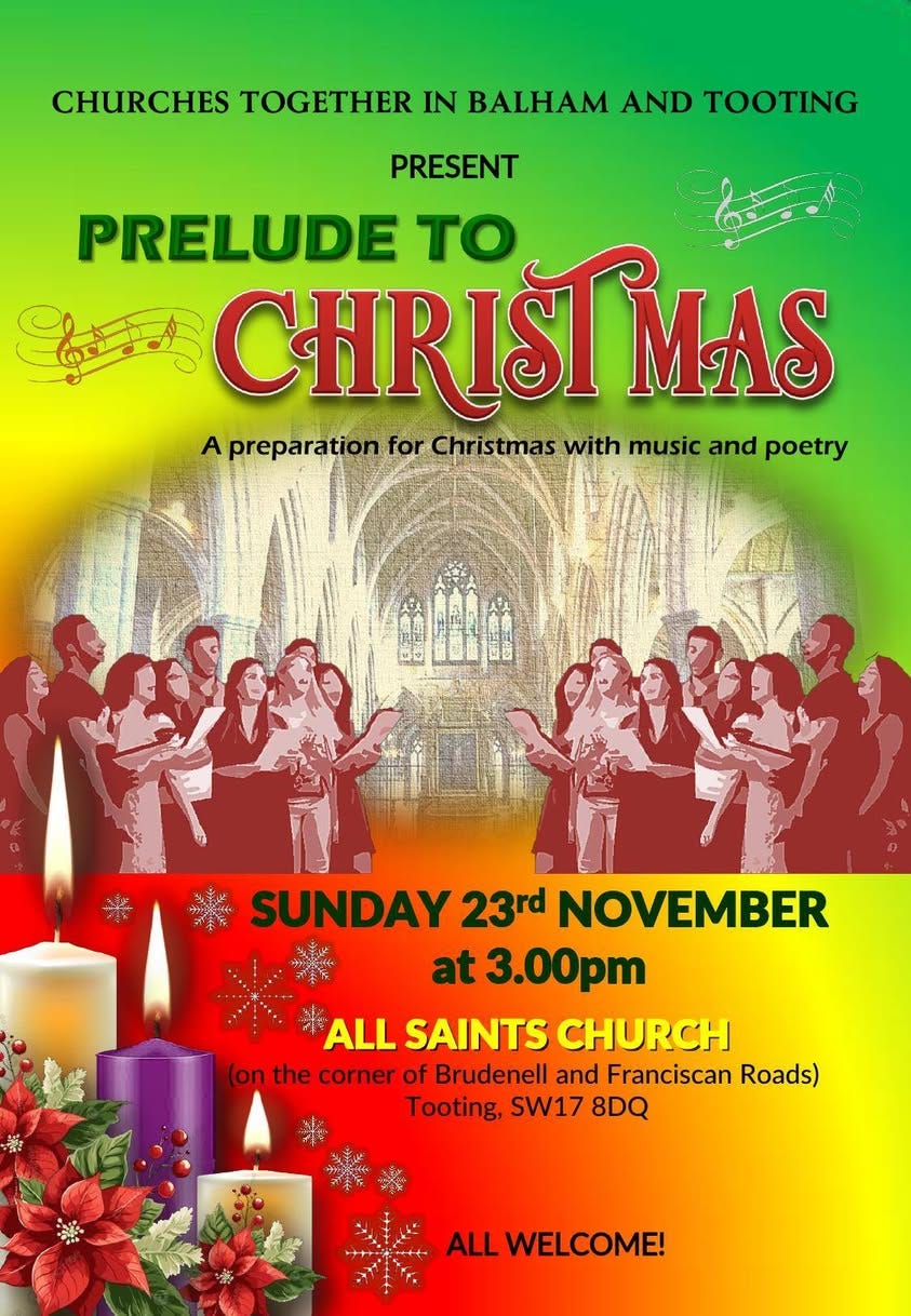 FREE ‘Prelude to Christmas’ Churches Together concert in Tooting this Sunday 23rd November, 3pm, at All Saints Church!