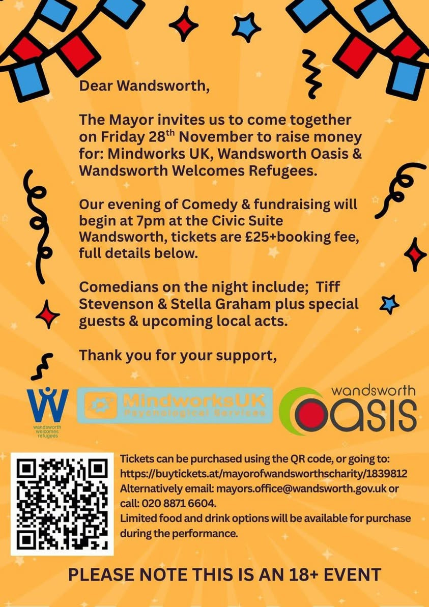Get ready for a night of non-stop laughter and community spirit at the Wandsworth Mayoral Charities’ Comedy Night – a special fundraising event in support of the Mayor’s three chosen charities: Mindworks UK, Wandsworth Oasis, and Wandsworth Welcomes Refugees.