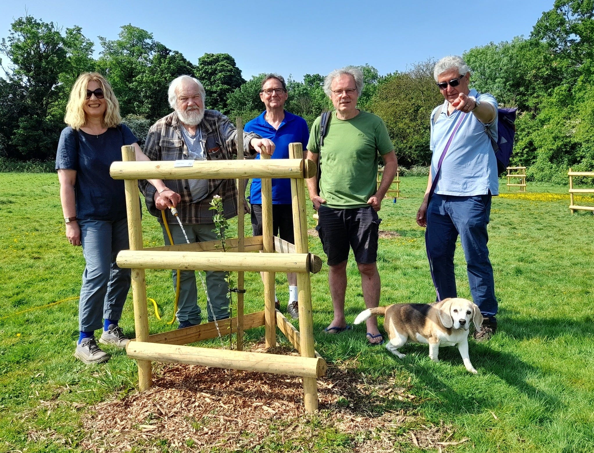 The new saplings are thriving and the first blossoms have appeared on the Ribston Pippin. They’ve also added labelling so you can identify each tree.