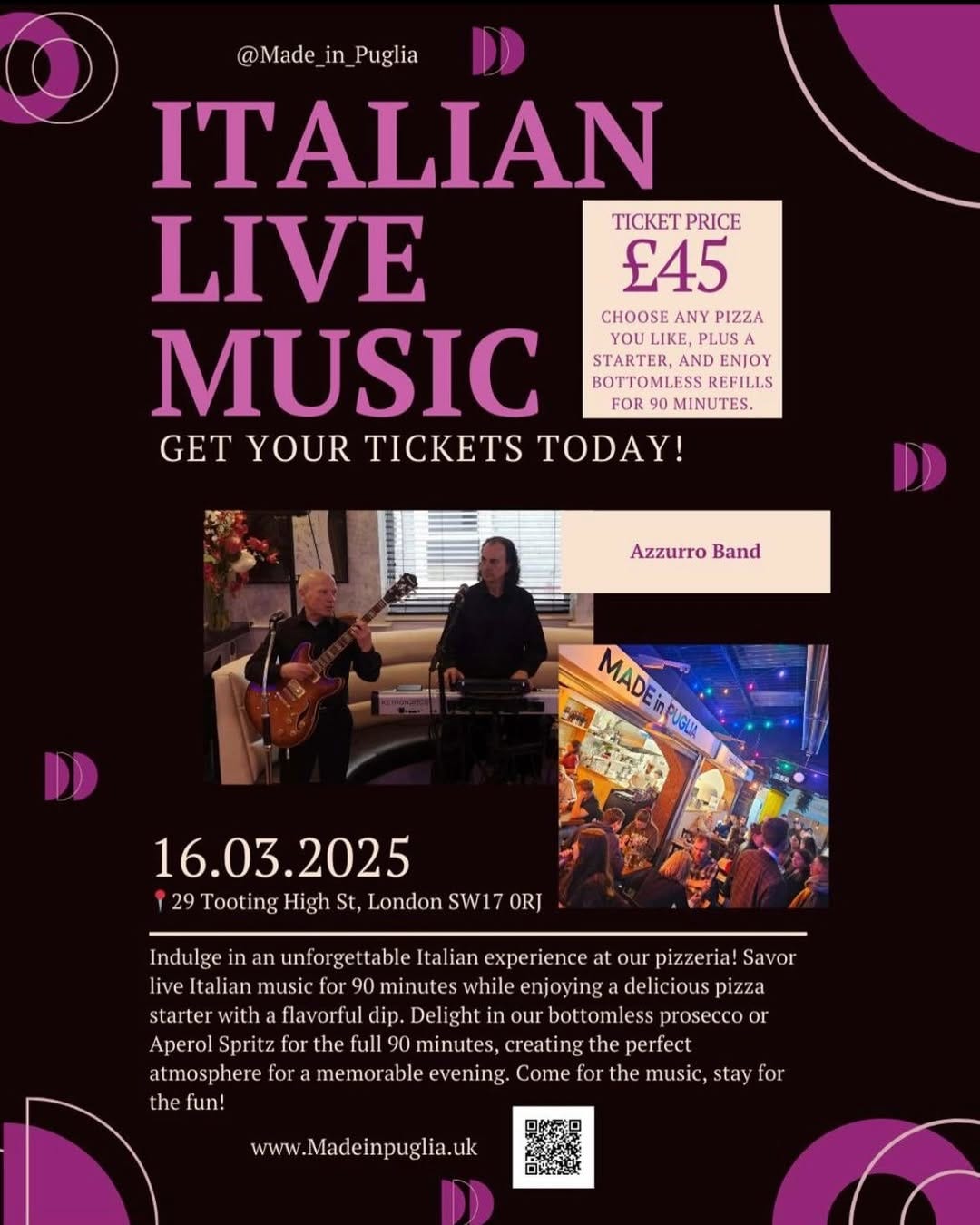 This Sunday in Tooting! Italian 🇮🇹 live music, pizza, and bottomless prosecco or Aperol Spritz at Made in Puglia in Broadway Market!