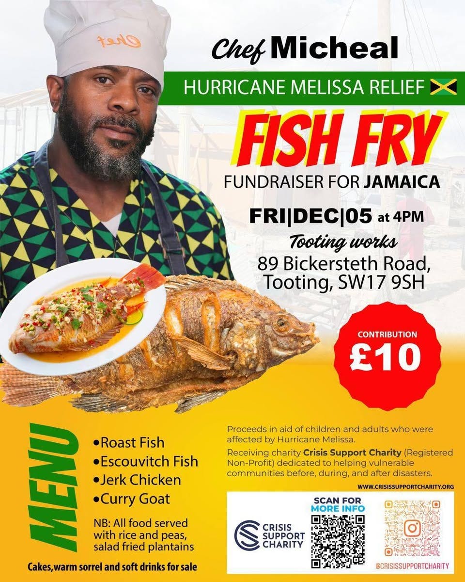 There’ll be fish, meat, and vegan options available. Enjoy your food in the Tooting Works Event Space or collect your order from the rear gate on Charlmont Road – look for the Jamaican flag. 🇯🇲