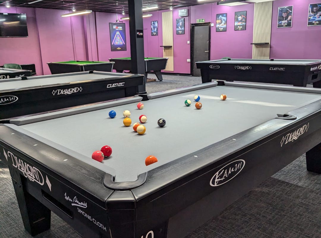 The new venue boasts five American Diamond tables (the only ones in the UK, the owner tells us) and four English Supreme tables. There's also a bar serving drinks and snacks.