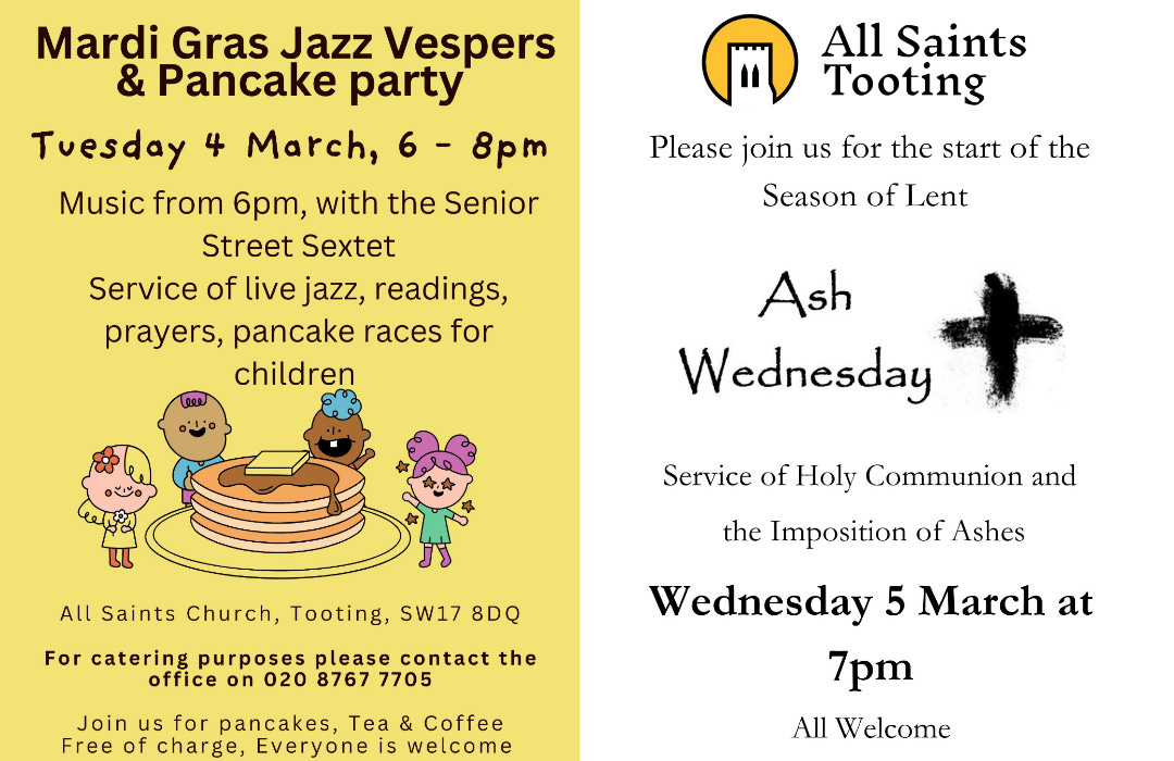 Join All Saints Church for their Mardi Gras and Jazz Vespers Pancake Party, Tuesday 4th March, 6pm-8pm! There'll be live jazz, readings, prayers, and pancake races for children.