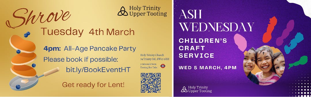 There'll also be a children’s Ash Wednesday Craft Service at 4pm on Wednesday 5th March. The church will give children and adults the opportunity to receive the sign of the cross in ash on their forehead if they’d like it, and spend some time reflecting, singing and crafting.
