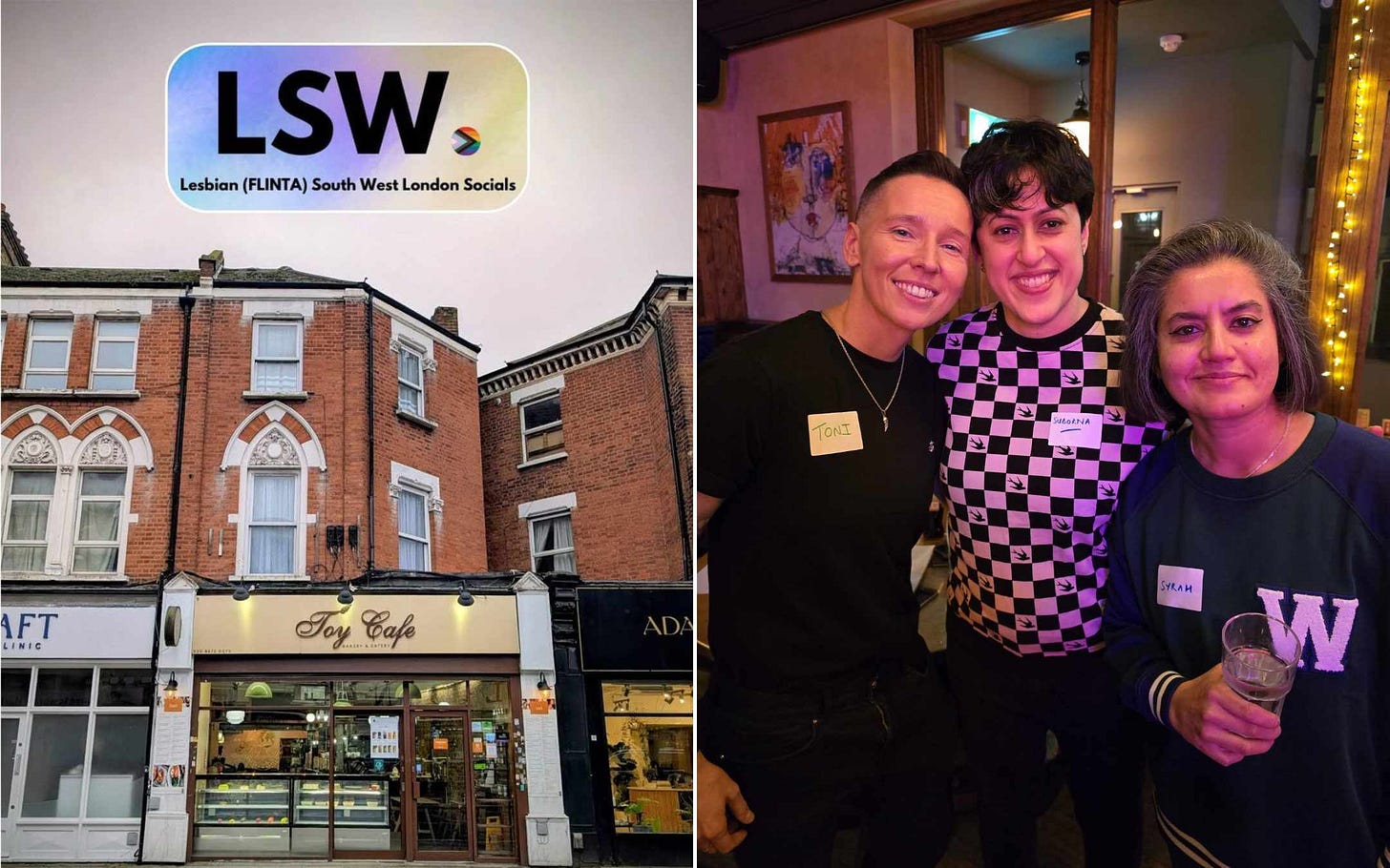 LSW is a lesbian (FLINTA) queer meet-up group based in Tooting, bringing together queer women and non-binary folks across South West London. They host regular socials in Tooting, Clapham, Balham, Colliers Wood, and beyond, all south of the river.