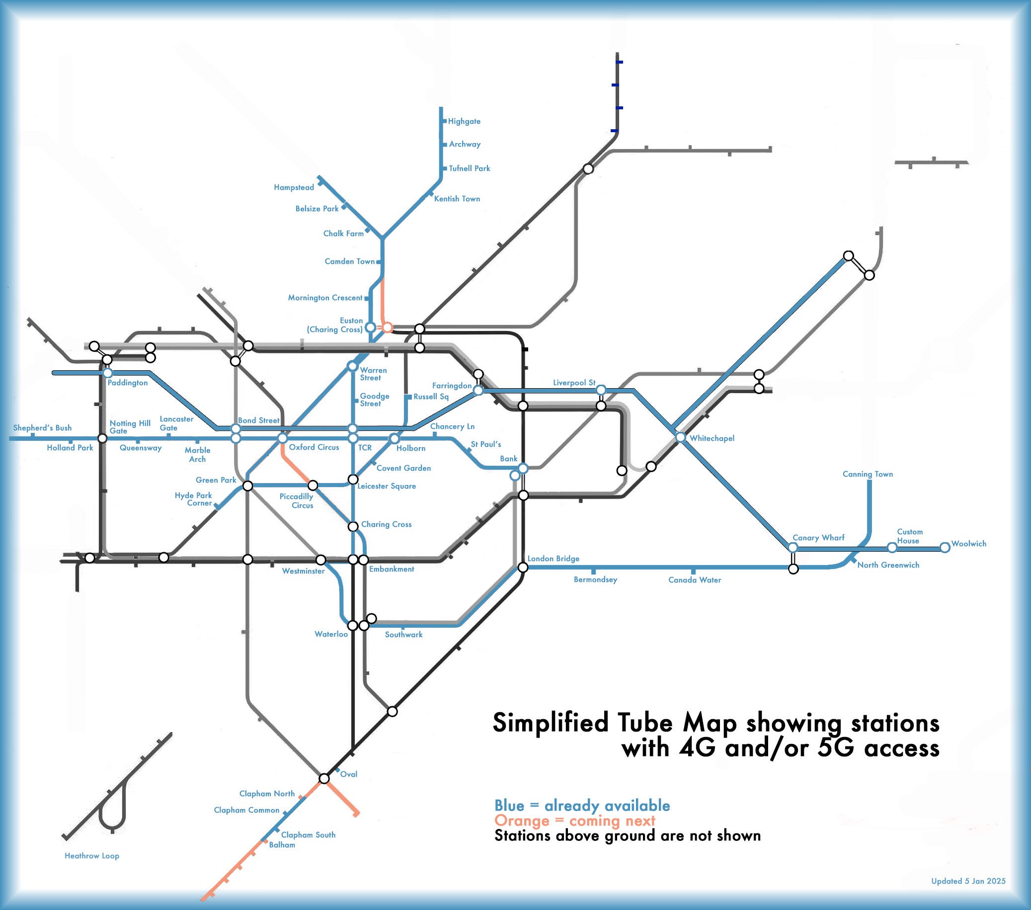 Transport for London is part way through a roll-out of 4G and 5G connectivity across the tube network and Elizabeth line, with 5G now available between Balham and Stockwell, with coverage also possible on the platforms at Oval.