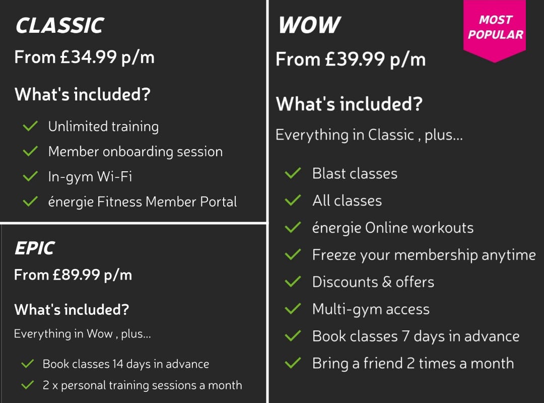 ⚡Their WOW Membership gets you unlimited class bookings from Pilates to calisthenics, yoga to strength and conditioning (and much much more), plus unlimited gym access, 2x guest passes a month, and multigym access (meaning you can attend other Energie Fitness gyms)– all for just £39.99 a month!